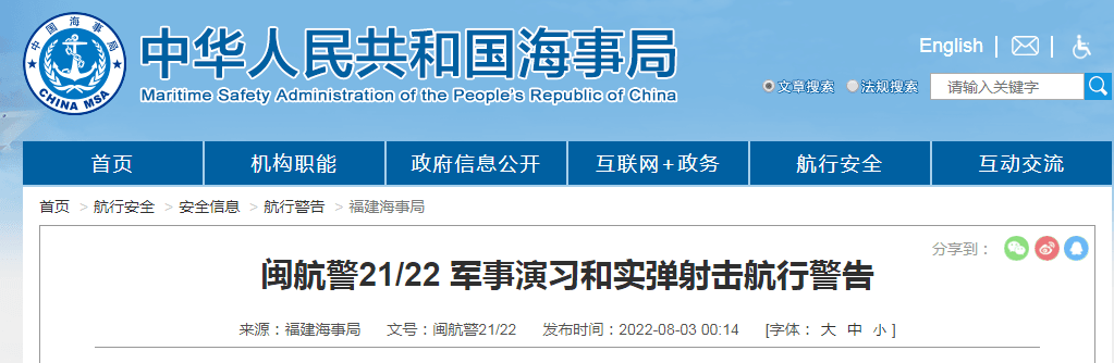 福建海事局發布閩航警21/22 軍事演習和實彈射擊航行警告,閩航警21/22 自2022年8月4日1200時至8月7日1200時在以下海域進行軍事演習和實彈射擊,禁止駛入。