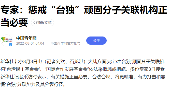 也就是說,無論是經濟還是軍事,多個領域的反制都會帶來嚴重的影響,且力度大小取決于后續的事態發展。國臺辦發言人馬曉光也表態,我們采取必要措施反制是維護主權和領土完整的應有之義、正當之舉。我們敦促有關組織和個人,停止混淆是非、顛倒黑白,停止為“臺獨”勢力和任何干涉他國內政的人辯解,用實際行動恪守在臺灣問題上作出的嚴肅承諾,恪守一個中國原則,停止任何干涉中國內政和挑釁中國主權和領土完整的行徑。
