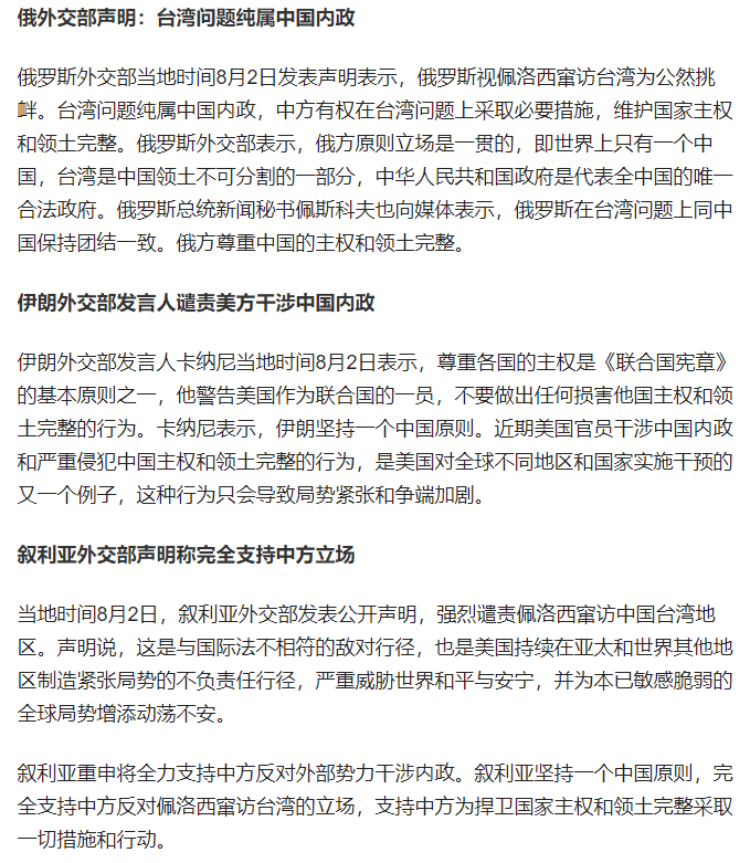 對于美國國會眾議長佩洛西不顧中方強烈反對和嚴正交涉,竄訪中國臺灣地區的行為,俄羅斯、伊朗、敘利亞、巴基斯坦等多國政府發表聲明表示強烈譴責,并重申支持一個中國原則。