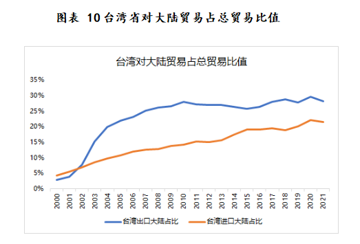 在經濟領域,從臺灣省和大陸的進出口貿易比值來看,臺灣省對大陸進出口貿易占比呈現逐漸上升走勢,且臺灣省與大陸貿易聯系日漸緊密。2021年臺灣省出口大陸地區貨品金額為1259億美元,占臺灣省總出口金額28.2%;臺灣省進口大陸地區貨品金額為825億美元,占臺灣省總金額21.6%。