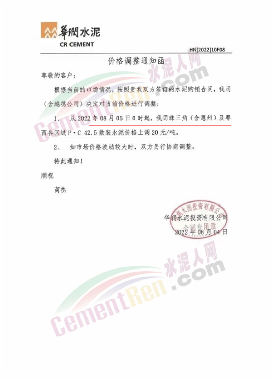 水泥人網通訊員消息,日前,華潤水泥投資有限公司通知,從8月4日0時起,公司廣東及海南地區熟料銷售價格上調20元/噸。潮汕及揭尾區域全品種散裝水泥,珠三角(含惠州)及粵西各區域P.C42.5散裝水泥價格同步上調20元/噸。