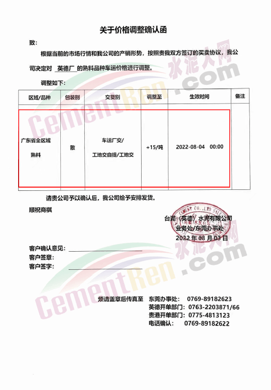 同期,臺泥(英德)水泥有限公司通知,廣東省全區域熟料價格自8月4日0時起上調15元/噸。
