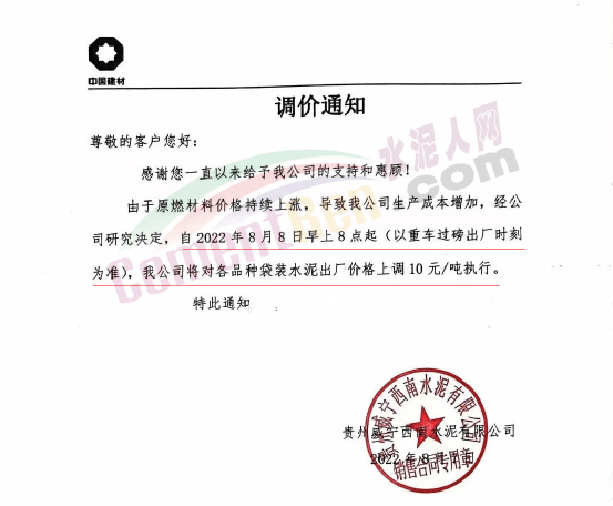 水泥人網通訊員消息,日前貴州威寧西南水泥有限公司通知,由于原燃材料價格持續上漲,導致公司生產成本增加,經公司研究決定,自8月8日早上8點起,對各品種袋裝水泥出廠價格上調10元/噸。