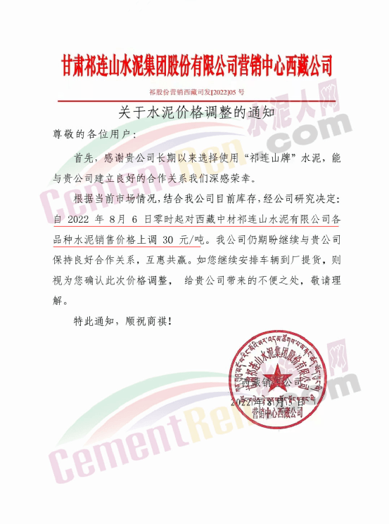 日前祁連山水泥集團西藏公司通知,根據當前市場情況,結合公司目前庫存,經公司研究決定自8月6日零時起對西藏中材祁連山水泥有限公司各品種水泥銷售價格上調30元/噸。調價后如繼續安排車輛到廠提貨,則視為確認本次調價。