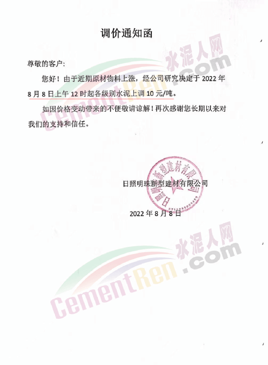 日照明珠新型建材有限公司通知,由于近期原材物料上漲,經公司研究決定于8月月8日上午12時起各級別水泥上調10元/噸。
