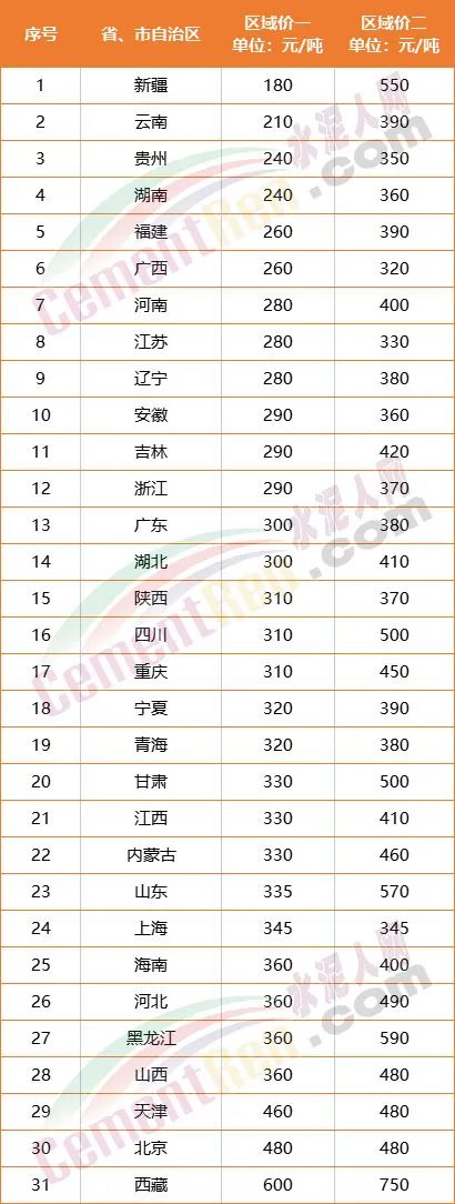 水泥人網信息中心監控數據顯示,目前各省、市自治區P.O42.5散裝水泥報價中除新疆區域跌破200元/噸外,云南、貴州、湖南、福建、廣西、河南、江蘇、遼寧、安徽、吉林、浙江等,全國近一半的區域水泥價格仍處于300元/噸以下。