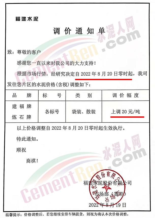 福建多家企業通知,8月20日起上調水泥價格20元/噸,通知一出,多家企業門頭又開始排隊了。