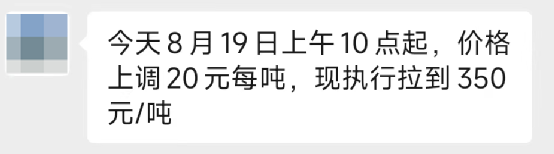 另一家河南企業通知,8月19日上午10時起,價格上調20元/噸。執行到位價350元/噸。