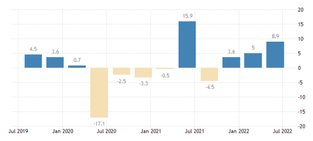 2022 年第二季度歐元區(qū)經(jīng)濟(jì)同比增長(zhǎng)3.9%,歐盟增長(zhǎng)4%,其中葡萄牙同比增長(zhǎng)6.9%,增幅在歐盟成員國(guó)中位居第二,僅次于斯洛文尼亞(8.3%)。2022年第一季度,葡萄牙經(jīng)濟(jì)同比增長(zhǎng)11.9%,是歐盟增幅最大的國(guó)家。預(yù)計(jì)2022 年全年經(jīng)濟(jì)增長(zhǎng)應(yīng)在 6.4% 至 6.8% 之間。
