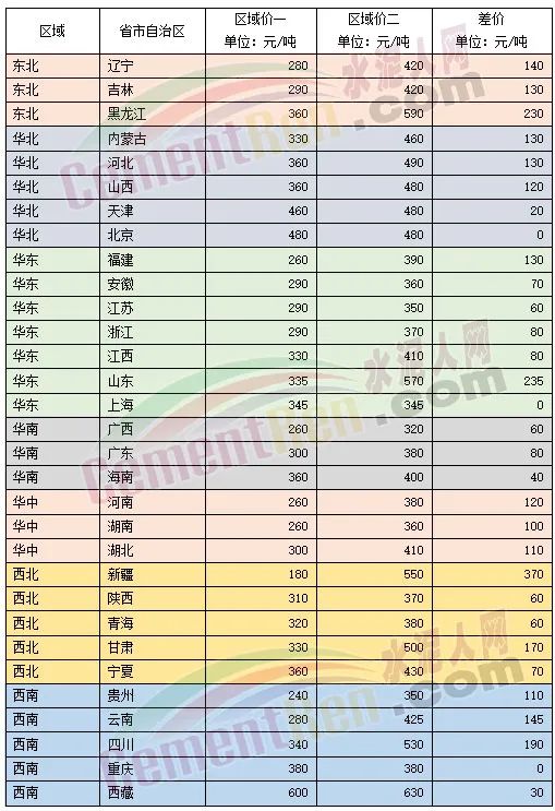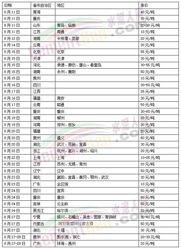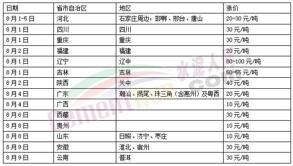 據水泥人網不完全統計7月中旬至8月初江蘇、浙江、上海、安徽、河南、山東、河北、福建、遼寧、吉林、陜西、重慶、四川、貴州、廣西等20多個區域水泥價格通知上調。進入8月中旬,發布漲價函的區域進一步擴大至青海、寧夏、內蒙、黑龍江、湖北、北京、天津等30多個區域。