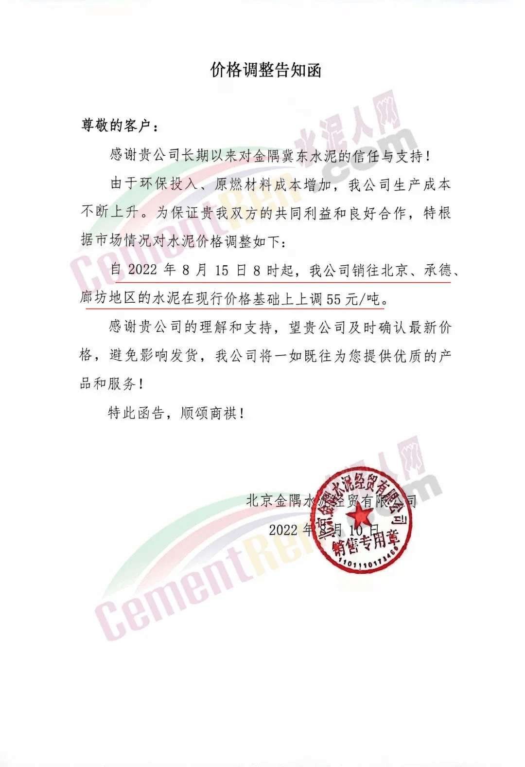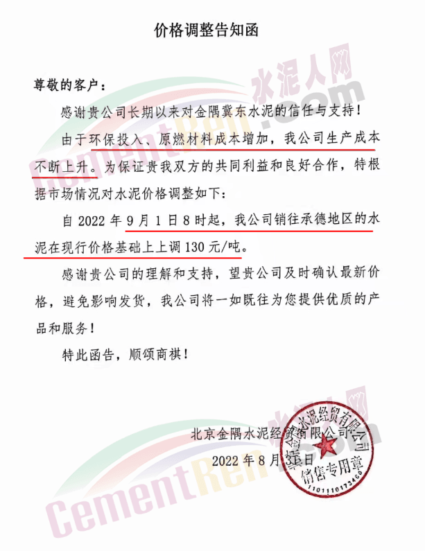 水泥人網通訊員消息:日前北京金隅經貿公司通知,由于環保投入、原燃材料成本增加,公司生產成本不斷上升。自2022年9月1日8時起,銷往承德地區的水泥在現行價格基礎上上調130元/噸。