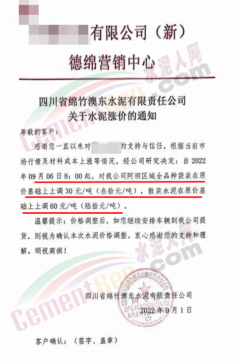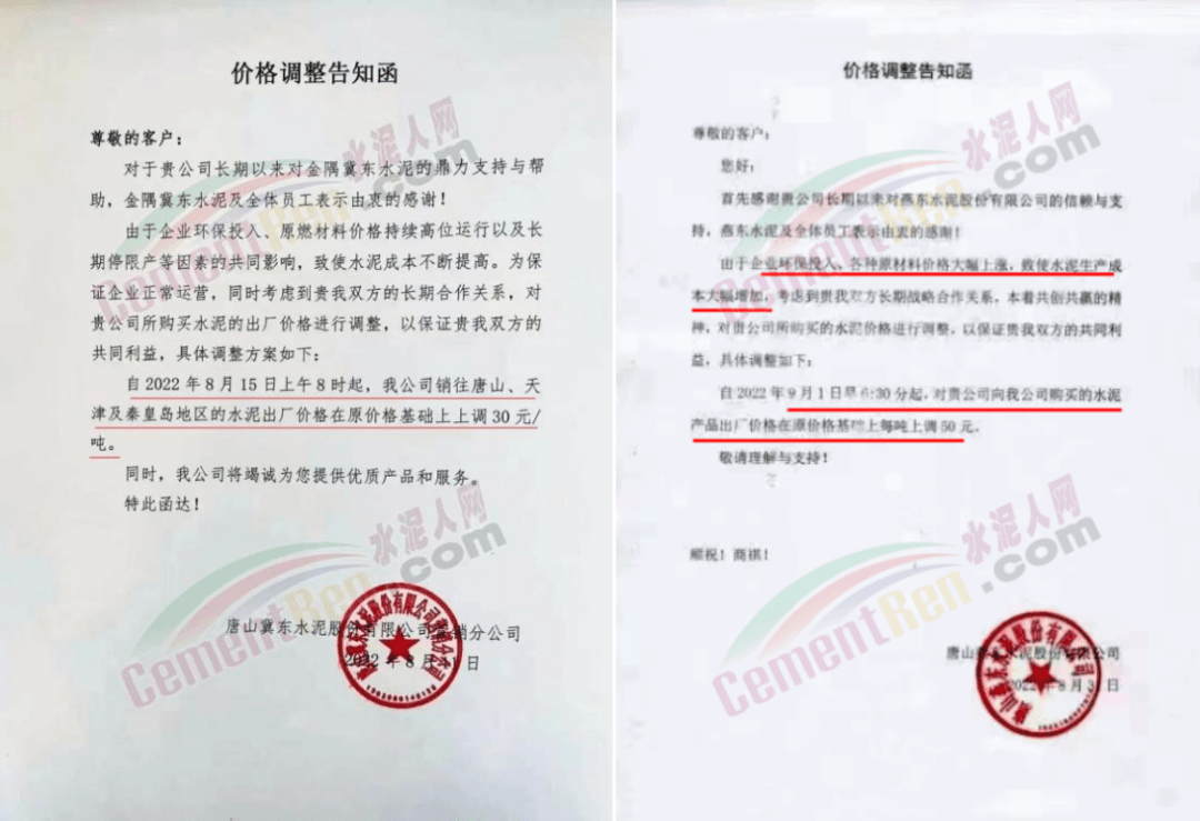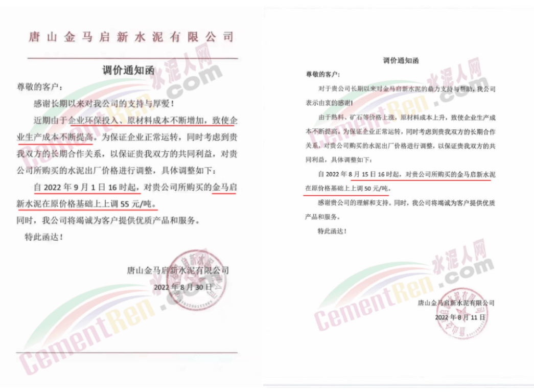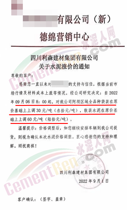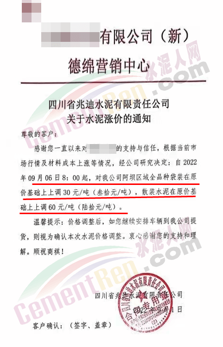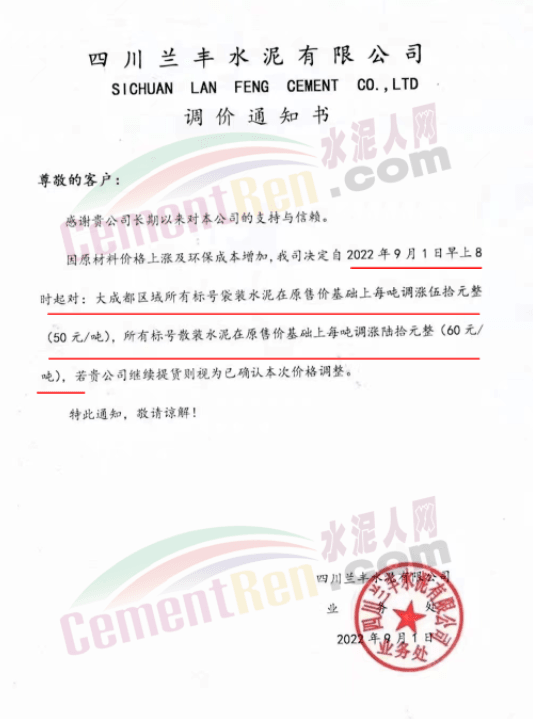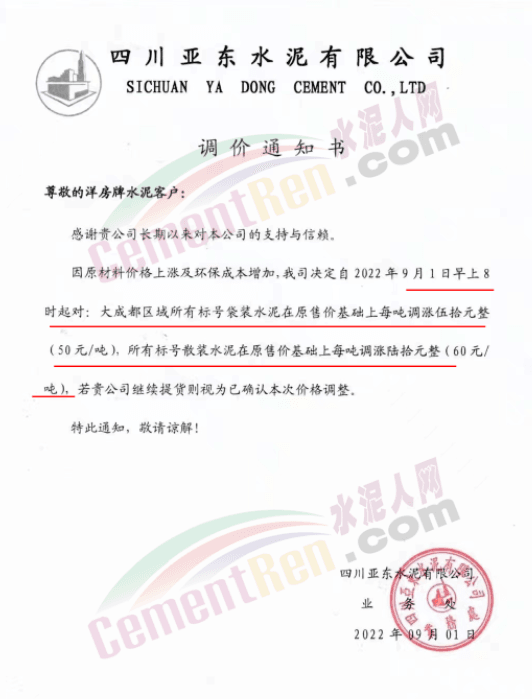 與此同時,四川亞東水泥、四川蘭豐水泥等水泥企業通知因原材料價格上漲及環保成本增加,自2022年9月1日早上8時起,大成都區域所有標號袋裝水泥在原售價基礎上上調50元/噸,所有標號散裝水泥在原售價基礎上調60元/噸。