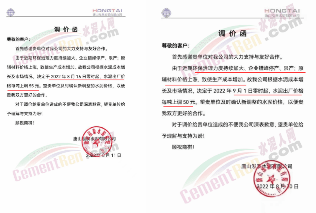 唐山泓泰水泥有限公司,分別于8月16日,9月1日上調水泥價格55元/噸、50元/噸,累計上調105元/噸。