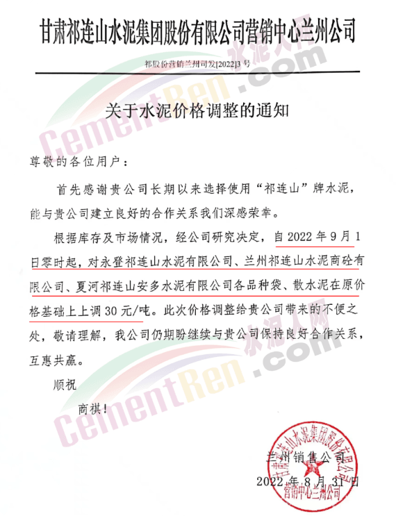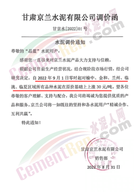 京蘭水泥通知,自2022年9月1日零時起對榆中、金和、蘭州、臨洮、臨夏區域所有品種水泥在原價基礎上上漲30元/噸。