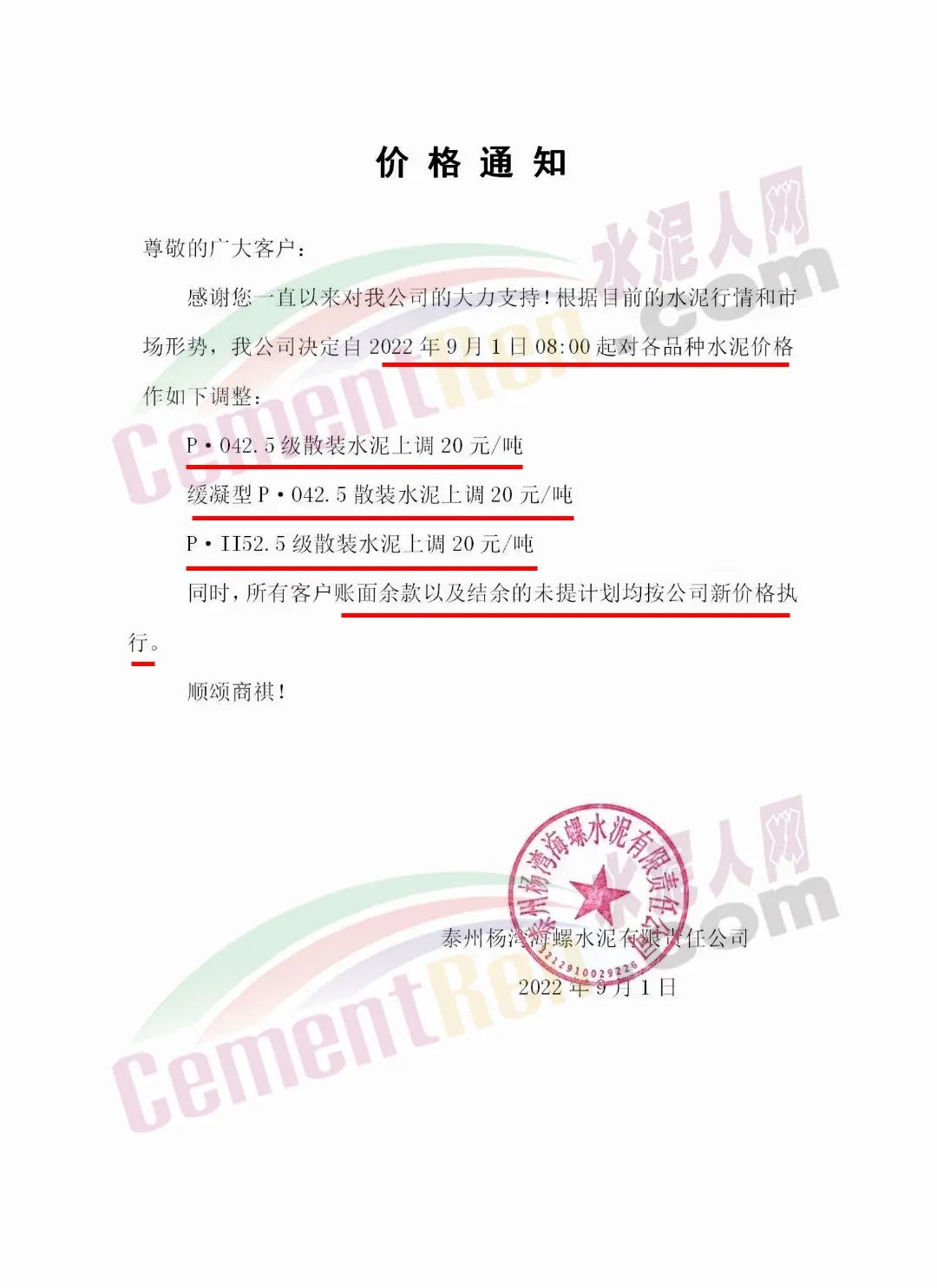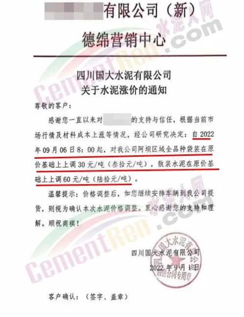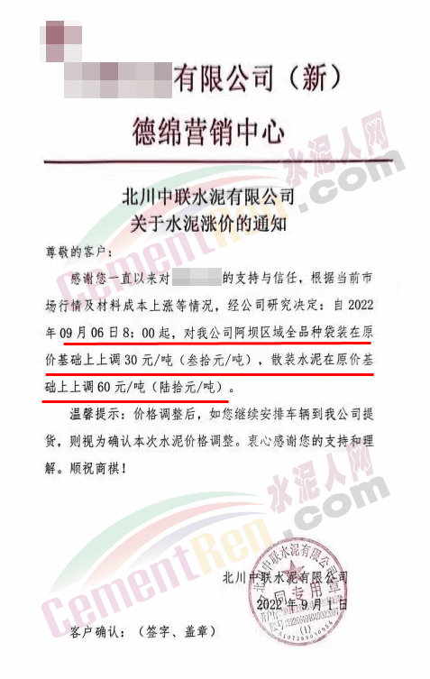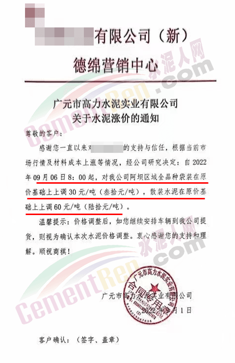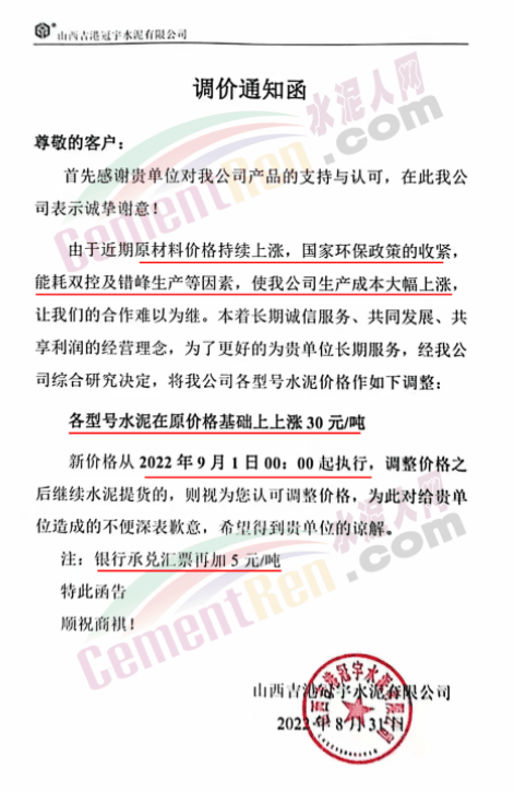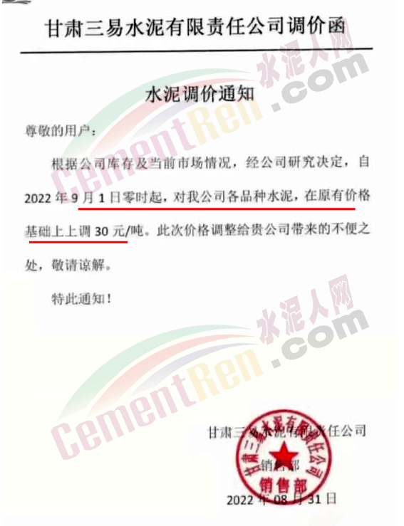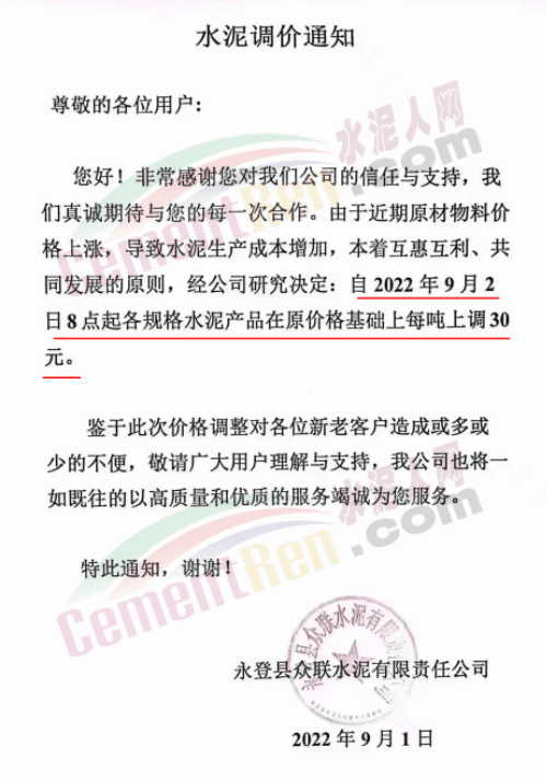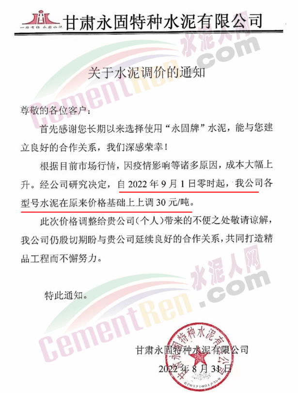 甘肅永固特種水泥有限公司通知因疫情影響等諸多原因,成本大幅上升。經公司研究決定,自9月1日零時起,各型號水泥在原價基礎上上調30元/噸。