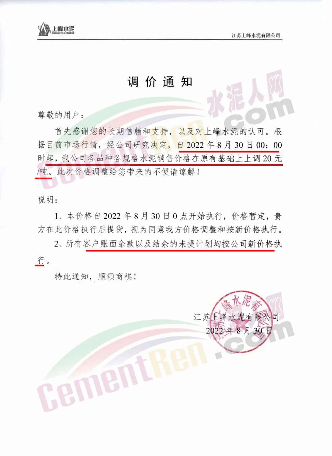 江蘇上峰水泥通知,8月30日0時起,各品種各規格水泥上調20元/噸,且所有客戶賬面余款以及結余的未提計劃均按公司新價格執行。