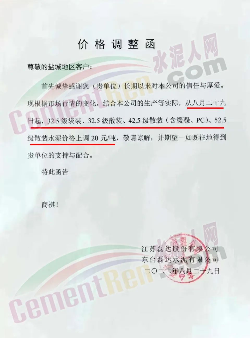 江蘇磊達水泥通知,8月29日起各標號水泥上調20元/噸。