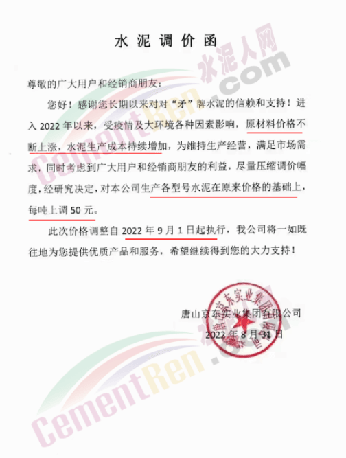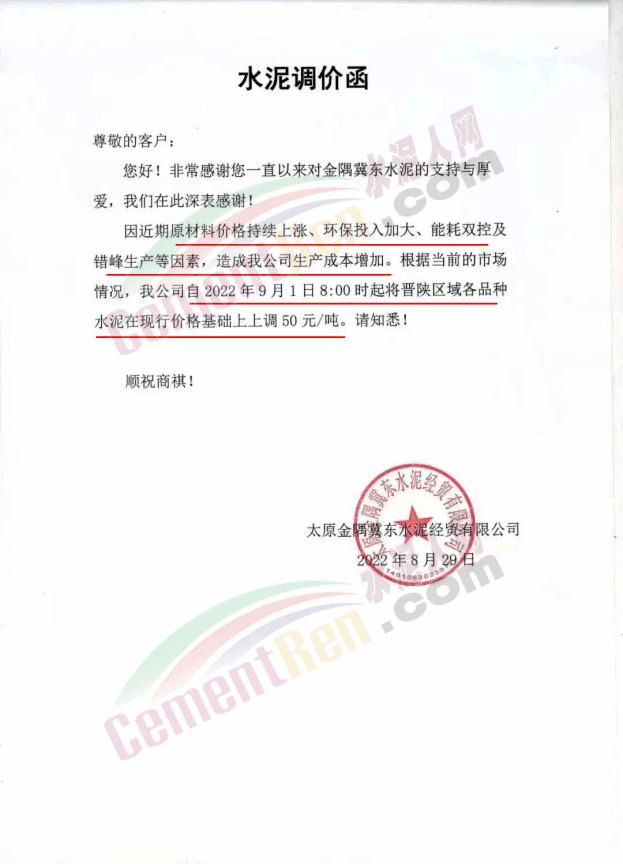 日前,太原金隅冀東水泥經(jīng)貿(mào)有限公司通知,因近期原材料價(jià)格持續(xù)上漲、環(huán)保投入加大、能耗雙控及錯(cuò)峰生產(chǎn)等因素,造成公司生產(chǎn)成本增加。根據(jù)當(dāng)前市場(chǎng)情況,自9月1日8時(shí)起晉陜區(qū)域各品種水泥在現(xiàn)行價(jià)格基礎(chǔ)上上調(diào)50元/噸。