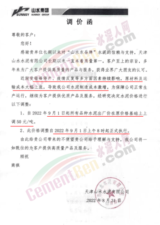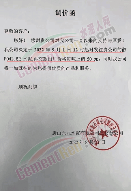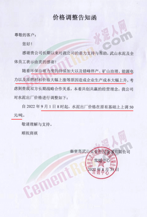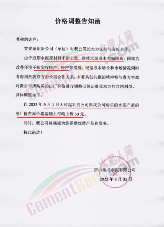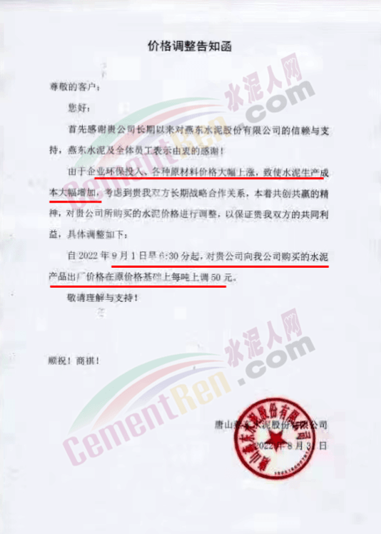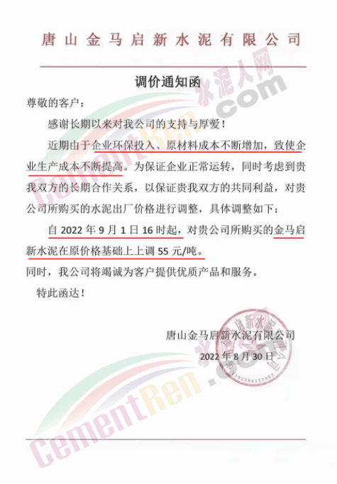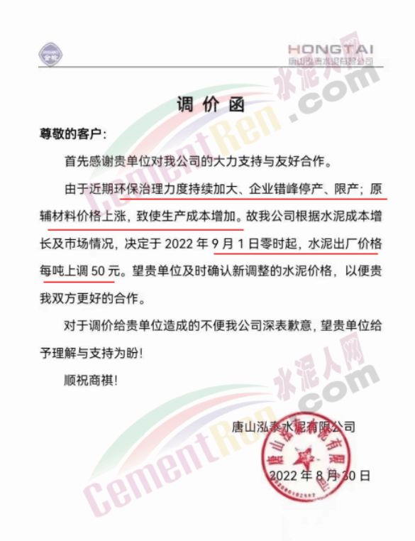 唐山冀東、泓泰、六九、圣龍、金馬啟新、京東、天津山水、秦皇島武山等水泥企業(yè)通知由于環(huán)保投入、各種原材料價(jià)格大幅上漲,致使水泥生產(chǎn)成本大幅增加。水泥價(jià)格自9月1日起上調(diào)50元/噸。這是繼8月份以來(lái)的第二次漲價(jià),也是9月的第一輪上漲。部分企業(yè)累計(jì)上漲已達(dá)100元/噸以上。