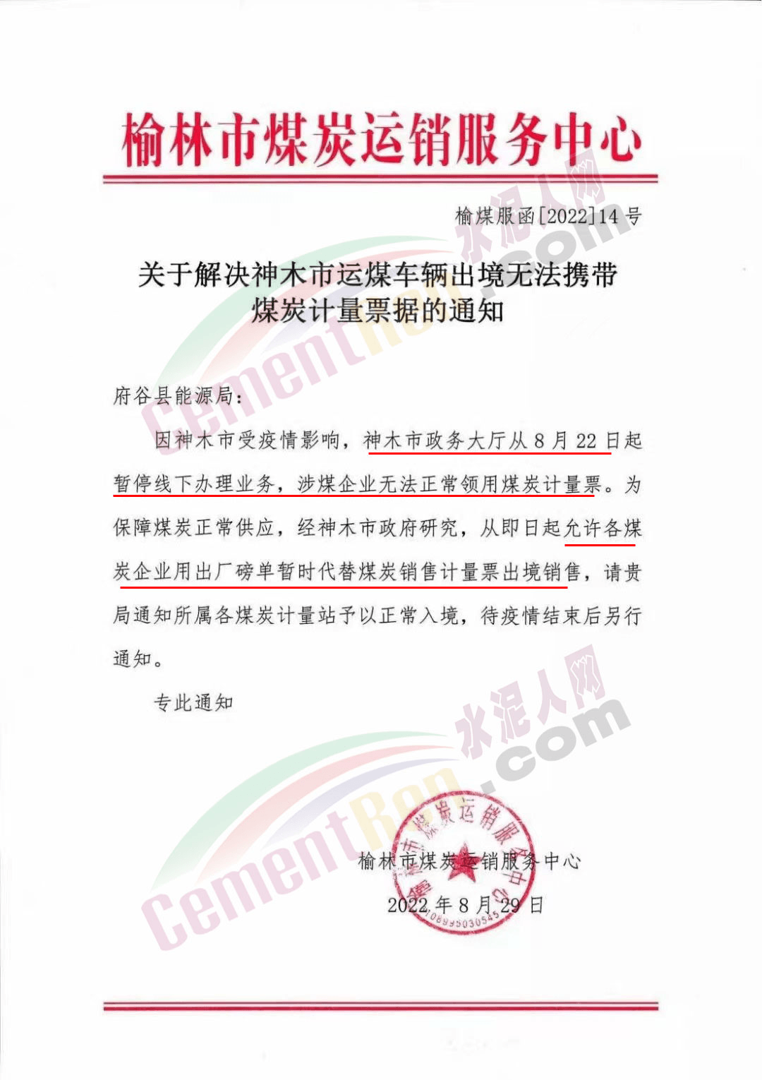 日前,榆林市煤炭運(yùn)銷售服務(wù)中心通知,因神木市受疫情影響,神木市政務(wù)大廳從8月22日起暫停線下辦理業(yè)務(wù),涉煤企業(yè)無(wú)法正常領(lǐng)用煤炭計(jì)量票。為保障煤炭正常供應(yīng),經(jīng)神木市政府研究,從即日起允許各煤炭企業(yè)用出廠磅單暫時(shí)代替煤炭銷售計(jì)量票出境銷售。