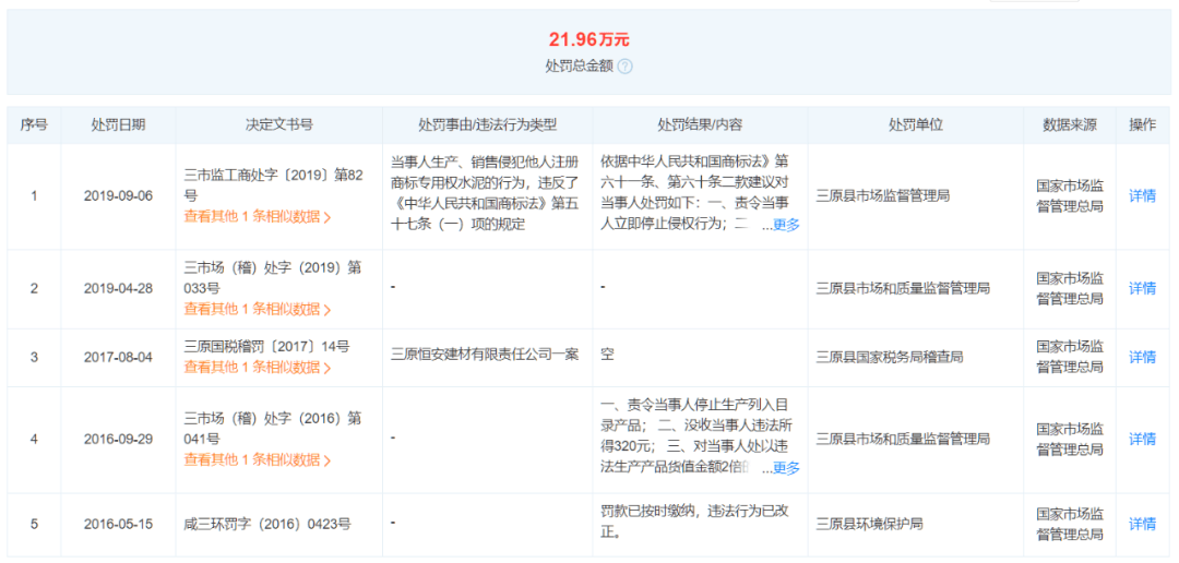 風(fēng)險方面共發(fā)現(xiàn)企業(yè)有天眼風(fēng)險信息42條; 還發(fā)現(xiàn)企業(yè)有法律訴訟5條, 涉案總金額2.6688萬元; 涉訴關(guān)系2條, 開庭公告1條, 立案信息2條。行政處罰共5條,處罰總金額共計21.96萬元。