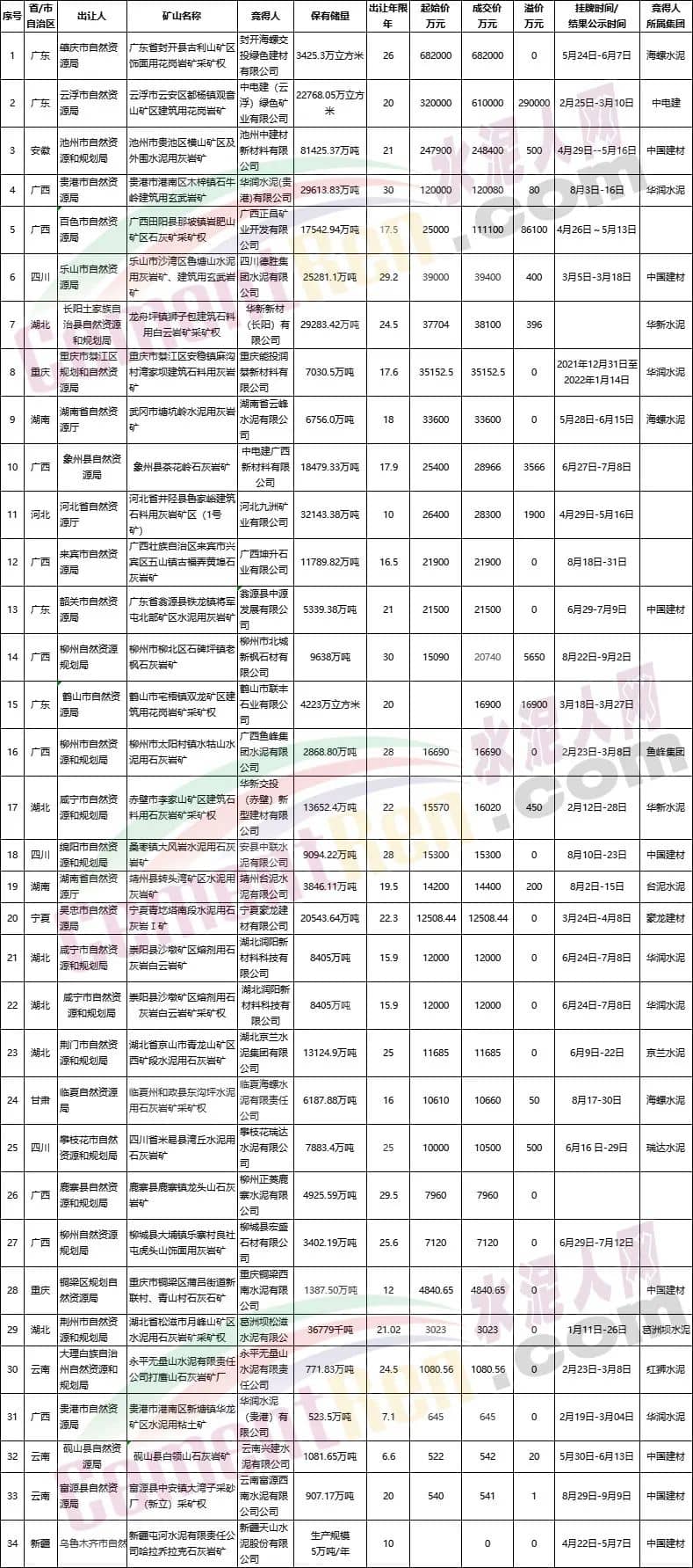 據水泥人網不完全統計,從近一年來公示公告的34宗采礦權掛牌出讓結果可見中國建材、海螺水泥、華潤水泥、華新水泥、紅獅水泥、臺泥水泥、豪龍建材、京蘭水泥等均有競得采礦權。其中,中國建材競得8宗采礦權,華潤水泥競得5宗,海螺水泥、華新水泥各競得2宗采礦權,其他企業僅競得1宗采礦權。