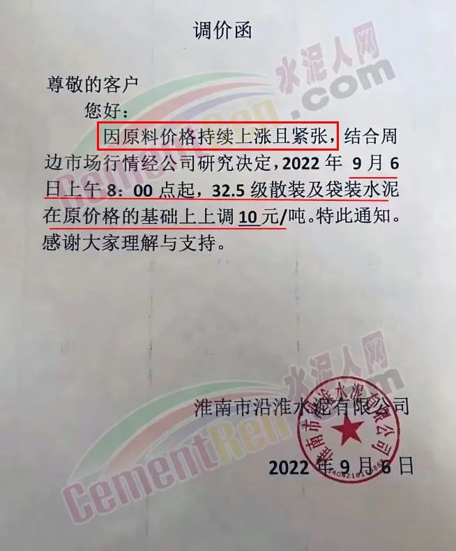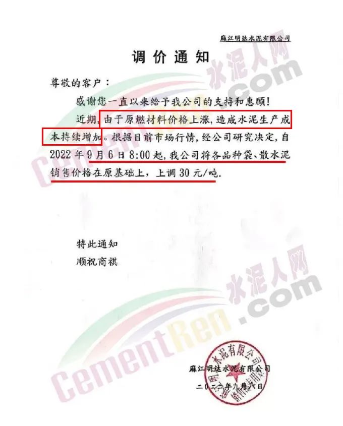 由于煤炭價格的不斷攀升,讓下游的水泥企業成本急劇上升,水泥企業也紛紛亮起漲價大旗,開始了漲價模式。企業漲價通知多稱因原燃材料價格上漲,成本增加。