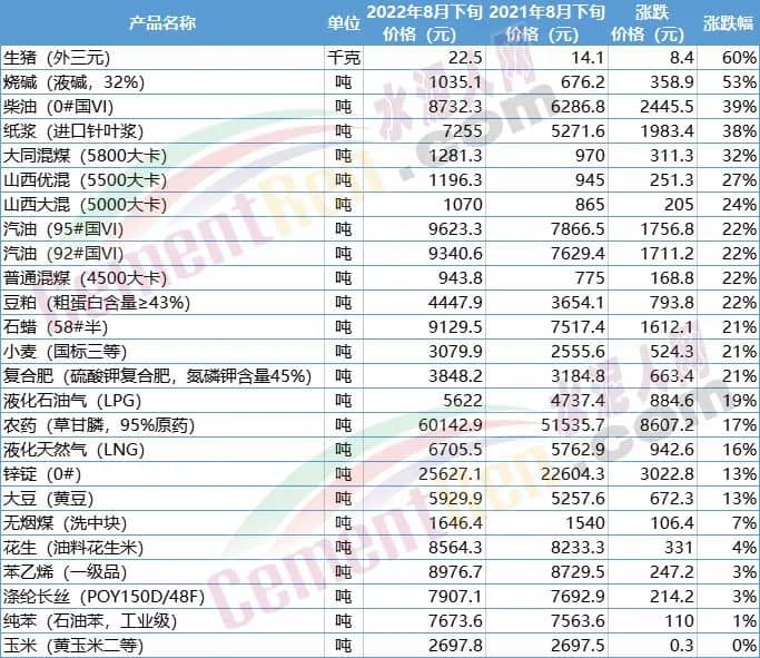 國家統計局近期公布的2022年8月下旬流通領域重要生產資料市場價格變動情況顯示,全國流通領域9大類50種重要生產資料市場價格的監測顯示,2022年8月下旬與8月中旬相比,25種產品價格上漲。同比上年同期生豬、燒堿、柴油、紙漿、煤炭、汽油、豆粕、石蠟、復合肥、小麥等14種產品價格漲幅超過20%,其中生豬價格上漲了60%,柴油(0#國VI)上漲了39%,紙漿(進口針葉漿)上漲38%,大同混煤(5800大卡)上漲了32%。