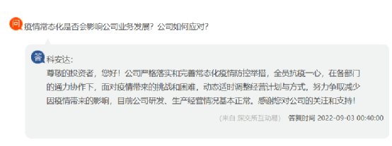 深圳從事軌道交通產(chǎn)品研發(fā)、生產(chǎn)、銷售的科安達(dá)回復(fù)公司嚴(yán)格落實和完善常態(tài)化疫情防控舉措,全員抗疫一心,在各部門的通力協(xié)作下,面對疫情帶來的挑戰(zhàn)和困難,動態(tài)適時調(diào)整經(jīng)營計劃與方式,努力爭取減少因疫情帶來的影響,目前公司研發(fā)、生產(chǎn)經(jīng)營情況基本正常。
