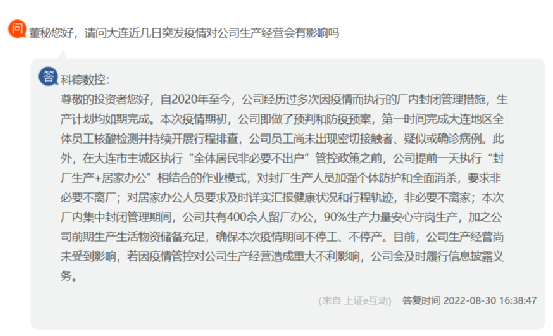 科德數(shù)控回復(fù)稱,本次疫情期初,公司即做了預(yù)判和防疫預(yù)案,第一時間完成大連地區(qū)全體員工核酸檢測并持續(xù)開展行程排查,公司員工尚未出現(xiàn)密切接觸者、疑似或確診病例。此外,在大連市主城區(qū)執(zhí)行“全體居民非必要不出戶”管控政策之前,公司提前一天執(zhí)行“封廠生產(chǎn)+居家辦公”相結(jié)合的作業(yè)模式,對封廠生產(chǎn)人員加強(qiáng)個體防護(hù)和全面消殺,要求非必要不離廠;對居家辦公人員要求及時詳實匯報健康狀況和行程軌跡,非必要不離家;本次廠內(nèi)集中封閉管理期間,公司共有400余人留廠辦公,90%生產(chǎn)力量安心守崗生產(chǎn),加之公司前期生產(chǎn)生活物資儲備充足,確保本次疫情期間不停工、不停產(chǎn)。目前,公司生產(chǎn)經(jīng)營尚未受到影響。