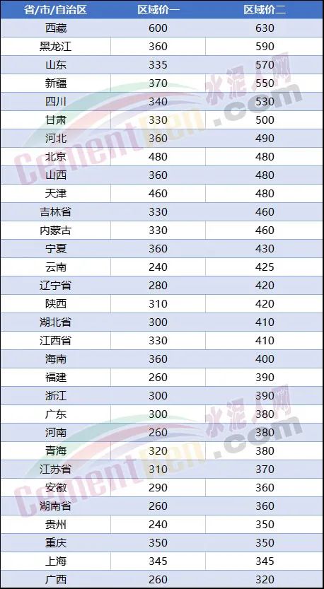 水泥人網信息中心數據顯示,目前市場較高價格仍在西藏、黑龍江、山東、四川、甘肅、河北、吉林等主要品牌企業占比權重相對較高的的區域。