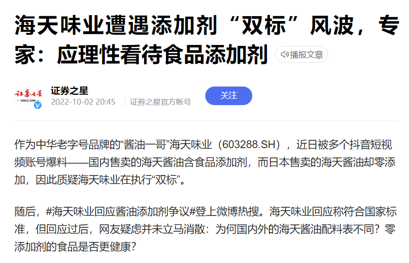隨著“海克斯科技”視頻博主辛吉飛的持續爆料,越來越多的產品出現在觀眾眼前。辛吉飛拍了一個制作勾兌醬油的方法,雖然沒指名道姓,但大家還是聯想到了“醬油一哥”海天味業。此后,多個抖音短視頻賬號爆料——國內售賣的海天醬油含食品添加劑,而日本售賣的海天醬油卻零添加,因此質疑海天味業在執行“雙標”。