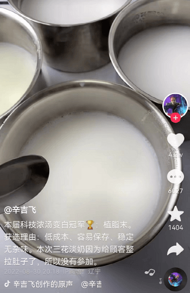 自己制作的羊雜湯之所以是奶白色,需要用牛骨燉煮很長時間,結果該博主直接在清水中加入“一勺三花淡奶”就調制出了濃稠奶白色的湯。一時間,“師傅熬高湯七個小時,我一勺三花淡奶加雞精顧客直呼童年味道”的說法火遍全網。