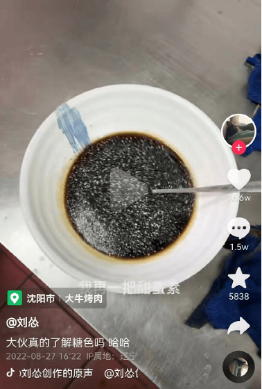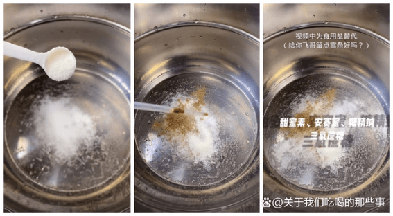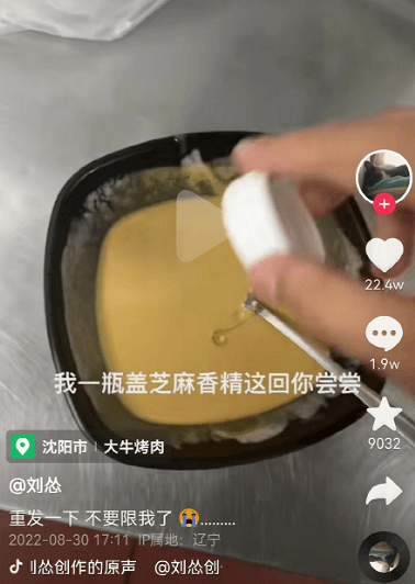 另一位“美食博主”劉慫也為大家帶來了“科技食物”的詳細制作方法。普通的一勺花生醬,加點自來水,加點食用油,加點焦糖色素,加點芝麻香精后,一碗外面賣的芝麻醬就做好了。
