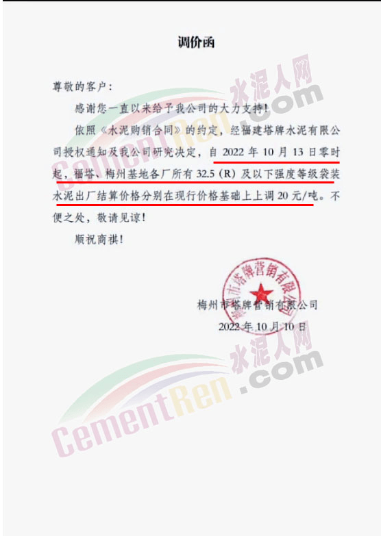水泥人網通訊員消息:日前,梅州市塔牌營銷有限公司通知,經福建塔牌水泥有限公司授權通知及公司研究決定,自10月13日 零時起,福塔、梅州基地各廠所有32.5(R)及以下強度等級袋裝水泥出廠價上調20元/噸。
