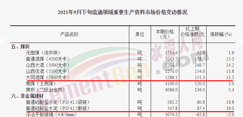 10月9日,國家統計局公布了2022年9月下旬流通領域重要生產資料市場價格變動情況,水泥人網注意到流通領域煤炭價格仍處于上行趨勢,各類型煤炭報價仍處于1000元/噸以上,其中5800大卡山西大同混煤報價1573.6元/噸,較上期上漲118.6元/噸;同比上年同期報價1289.1元/噸,上漲284.5元/噸。同期P.O42.5散裝水泥報價389.8元/噸,上漲8.2元/噸,漲幅2.1%,仍未突破400元/噸大關;同比上年同期547.8元/噸報價下跌158元/噸。