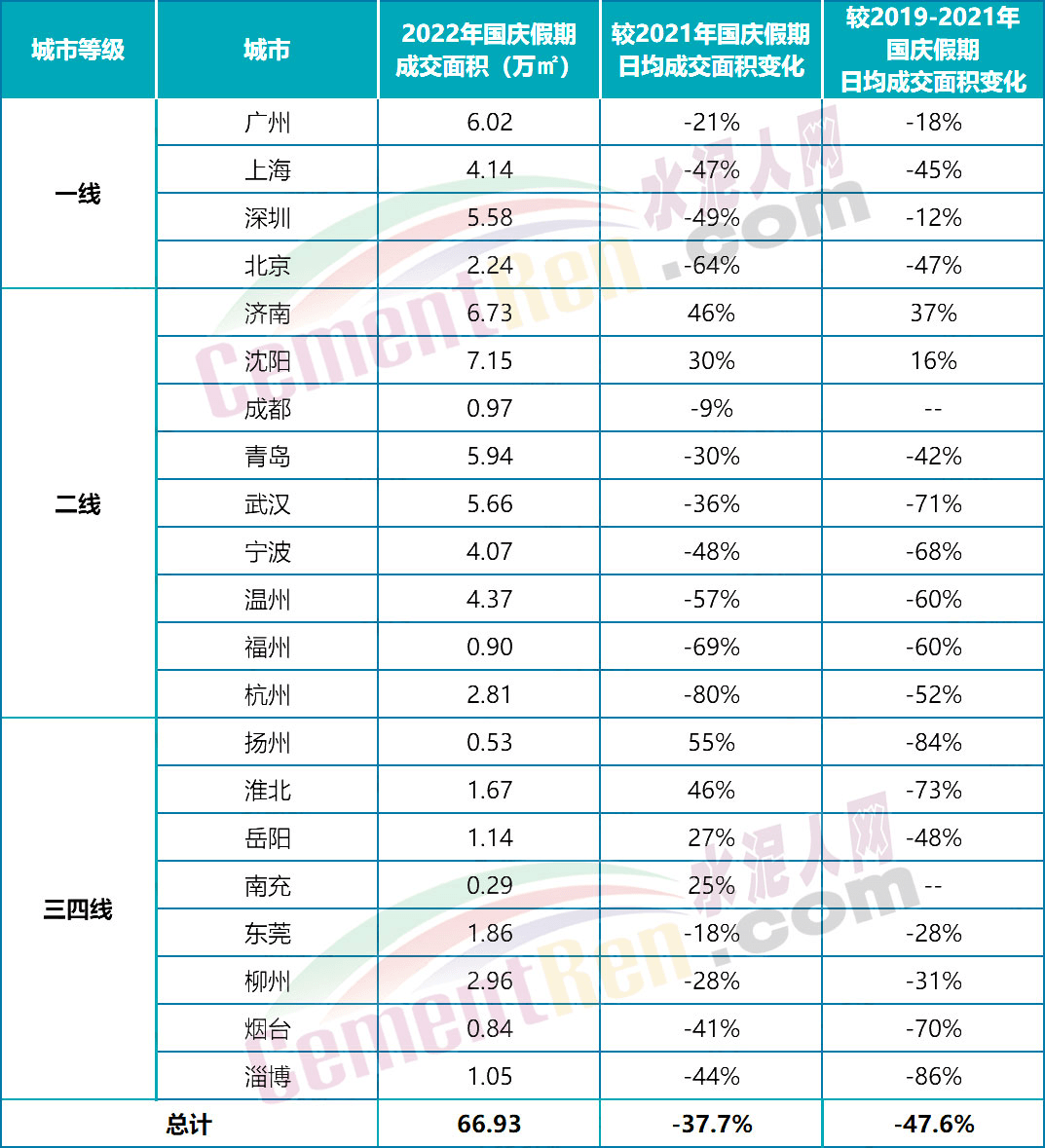 注:北京2021年國慶假期成交數據剔除恒大兩個集中網簽項目;總計中較2019-2021年國慶假期日均成交面積變化不含成都、南充