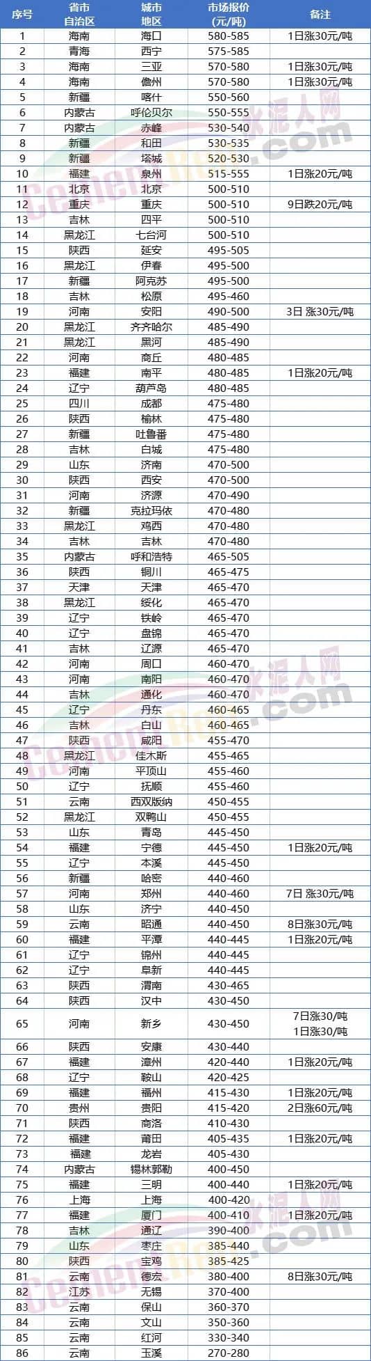 貴州黃平尖峰水泥通知,因近期煙煤價格持續上漲和執行4季度錯峰生產,導致水泥生產成本大幅上升,經公司研究決定自10月10日起銷往黔南、黔東南以及遵義區域的各品種水泥價格上調40元/噸。