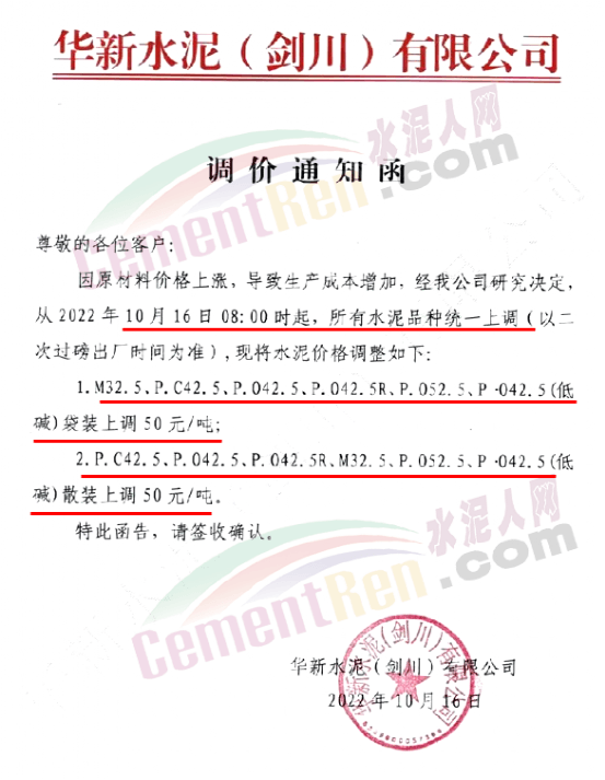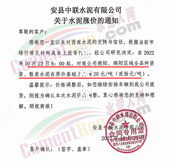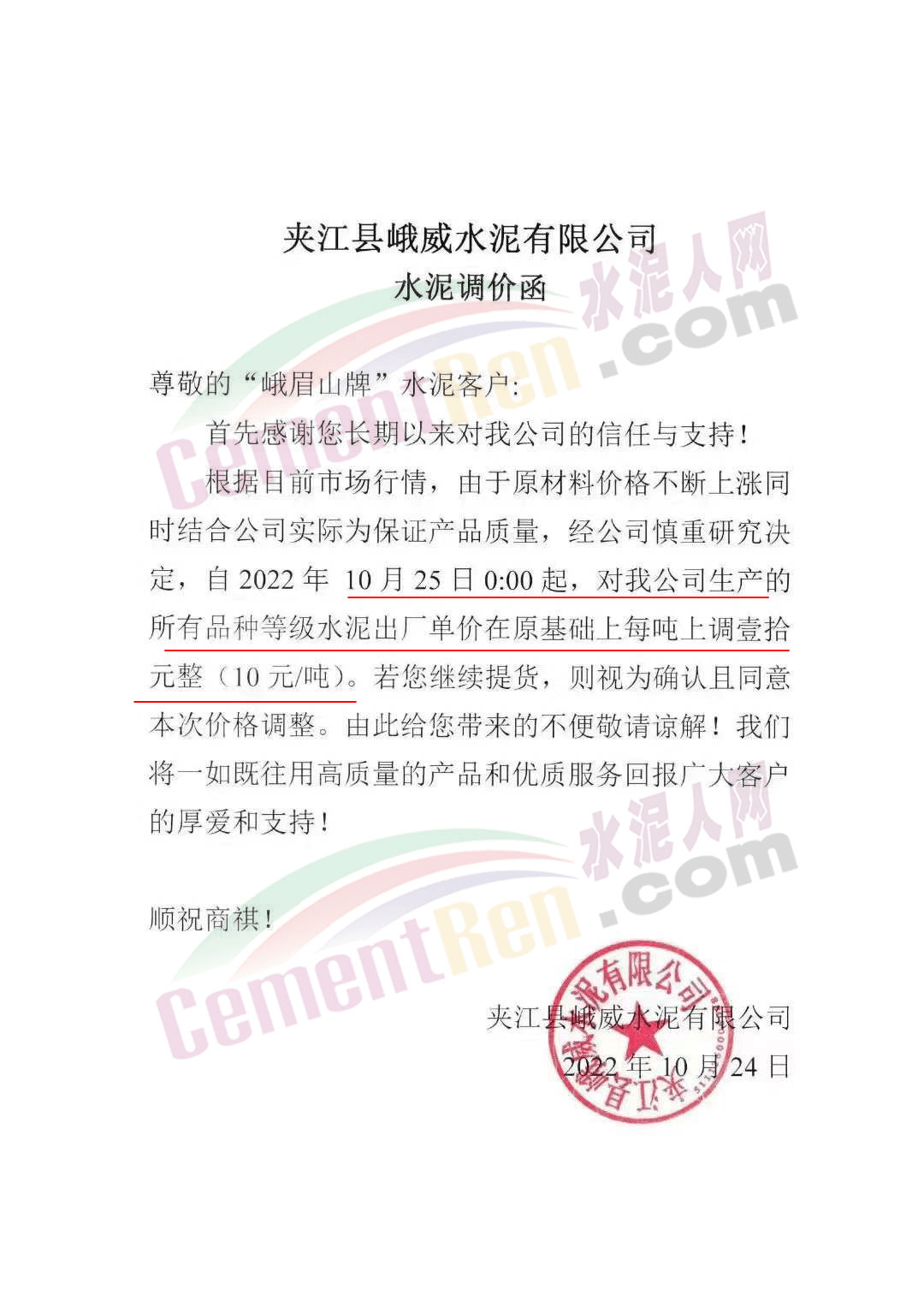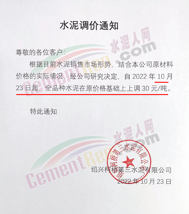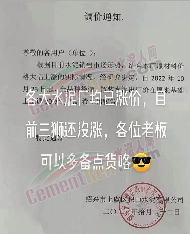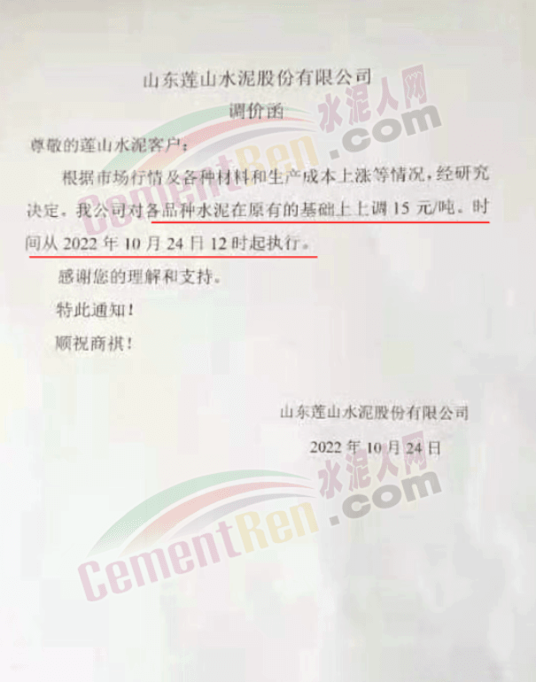 山東蓮山水泥股份有限公司通知,根據市場行情及各種材料和生產成本上漲等情況,經研究決定,從10月24日起對各品種水泥在原基礎上上調15元/噸。