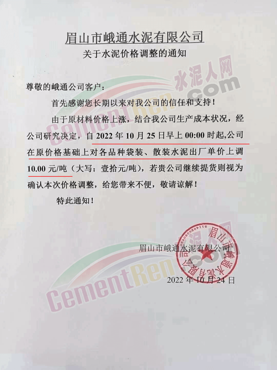 四川眉山多家水泥企業通知上調水泥價格10元/噸,經銷商表示,這是“溫柔一刀”。