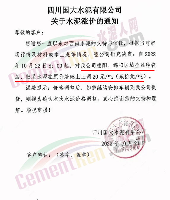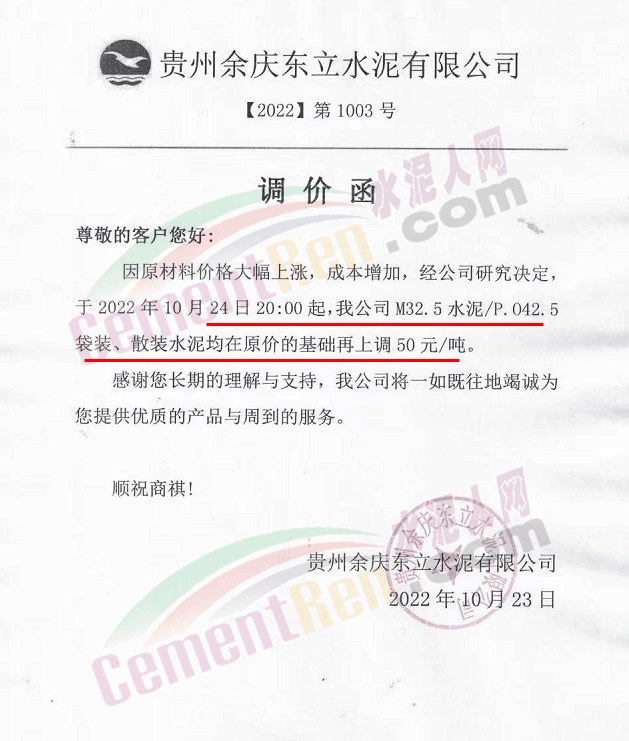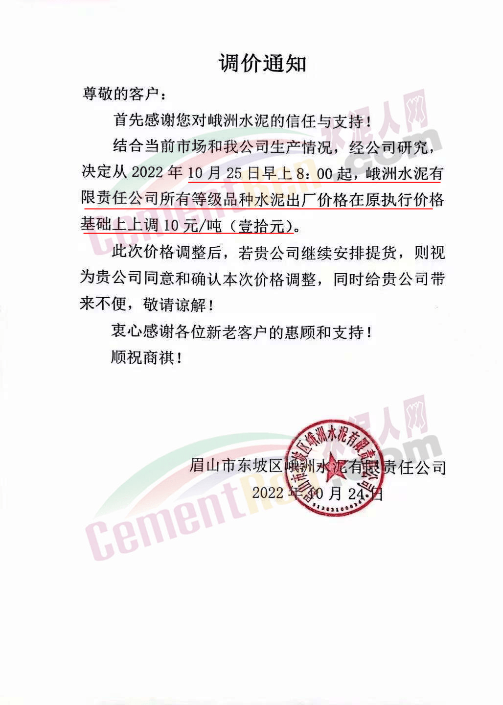 貴州西南遵義營銷中心通知,10月23日起各品種水泥價格上調60元/噸.