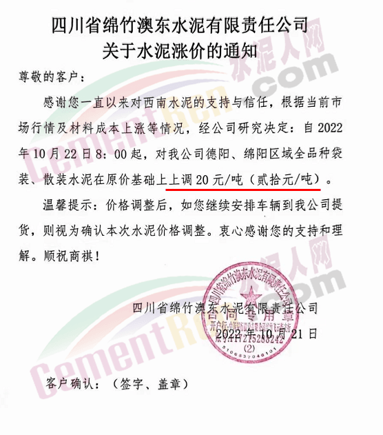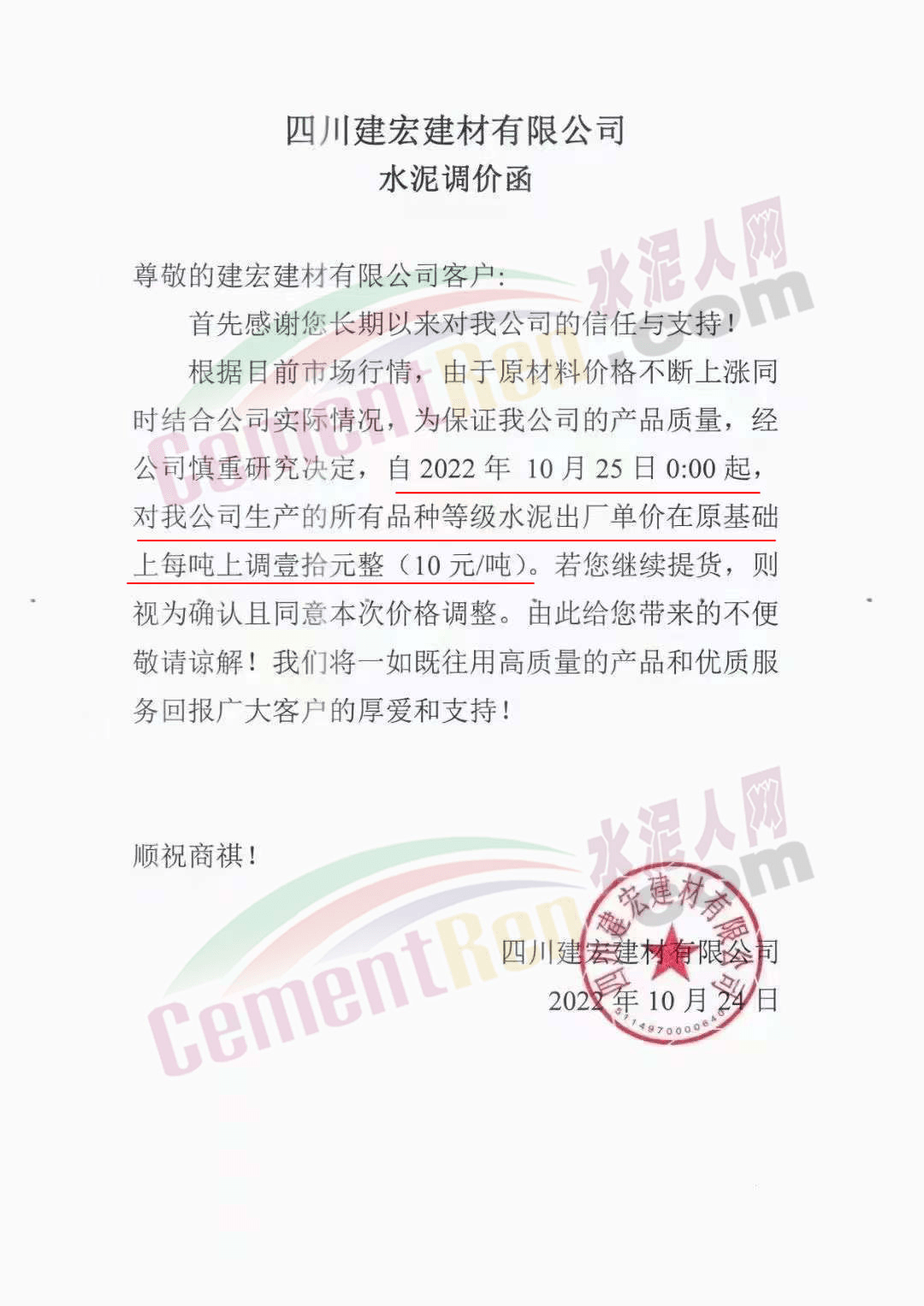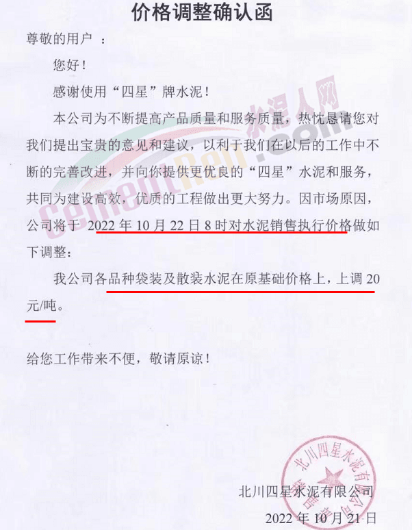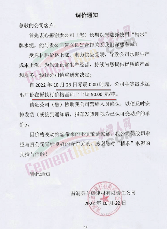 云南省大理白族自治州南澗縣金球建材有限責任公司通知,受原材料價格上漲,電力供應受限,導致公司水泥生產成本上漲。自10月23日0時起上調50元/噸。