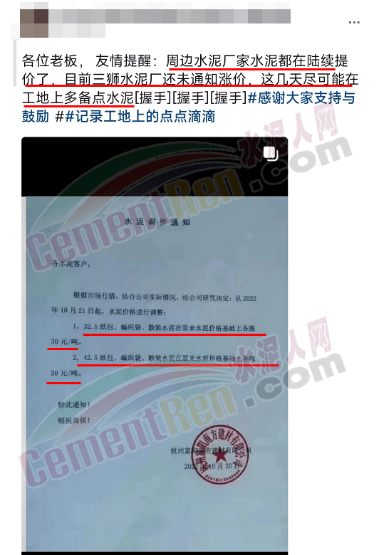 浙江杭州、紹興區域水泥價格上調30元/噸,經銷商提醒周邊水泥廠家都在陸續提價,建議施工企業近幾天盡可能在工地上多備點水泥。