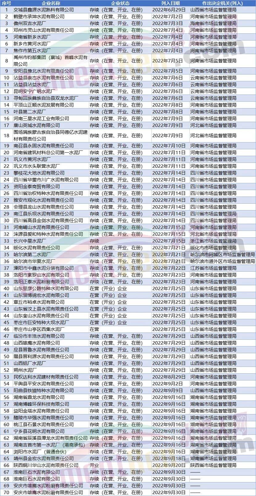 據水泥人網查詢,近年來被列入嚴重違法失信的水泥企業并非只有這一家。僅2022年1月至今就有70家水泥企業被列嚴重違法失信企業名單。