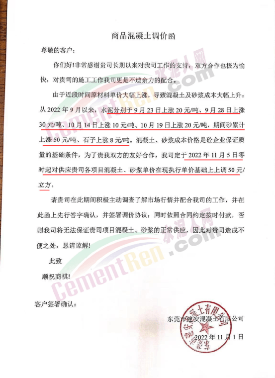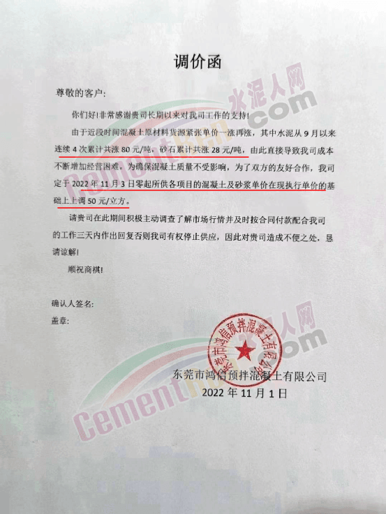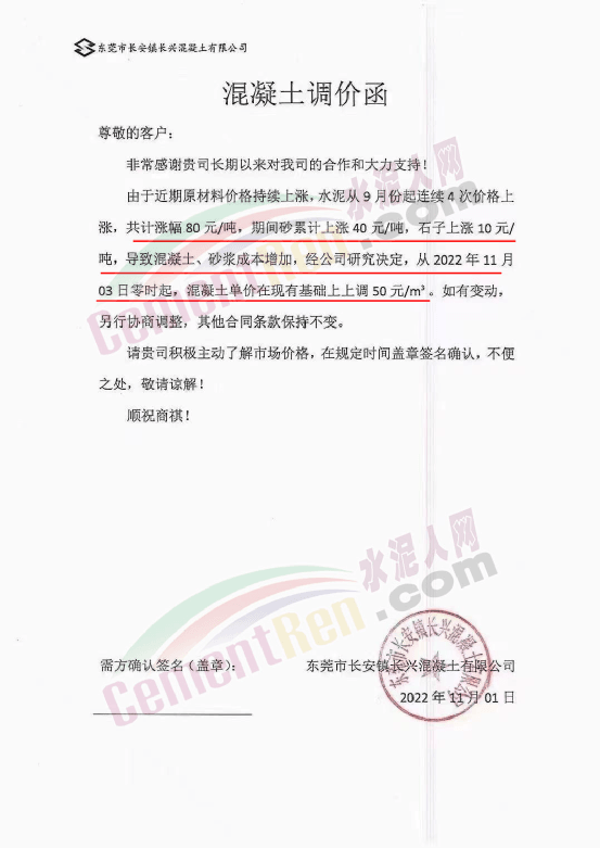 企業調價通知稱,從9月份開始,水泥、砂石等原材料上漲,造成混凝土企業生產成本增加,其中水泥4輪連漲,累計上漲80元/噸,砂上漲40-50元/噸,碎石上漲8-10元/噸。混凝土企業所供各項目的混凝土、砂漿價格跟進上調50元/噸。