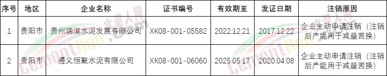 貴州省注銷工業產品生產許可證2家,均為企業主動申請注銷(注銷后產能用于減量置換);