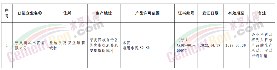 寧夏回族自治區注銷寧夏萌成水泥有限公司生產許可證,企業不再從事列入目錄產品的生產活動,主動申請注銷;