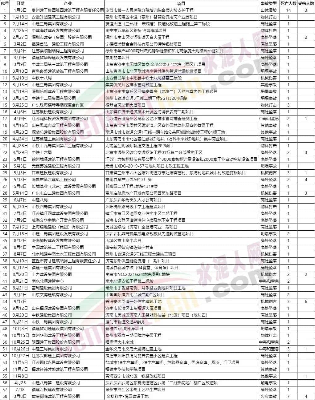 據水泥人網不完全統計2022年1月以來,高處墜落、機械傷害、坍塌等事故多發于在建項目工地,其中承建、總包企業不乏中建、中鐵集團公司等公司旗下企業。