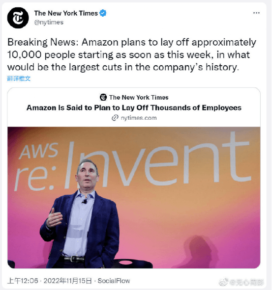 當地時間 11 月 16 日,亞馬遜公司證實開始裁員計劃,預計將裁約 10000 人,這將是該公司歷史上最大規模的裁員。據報道,裁員主要集中在公司的設備組織、零售部門和人力資源部門。