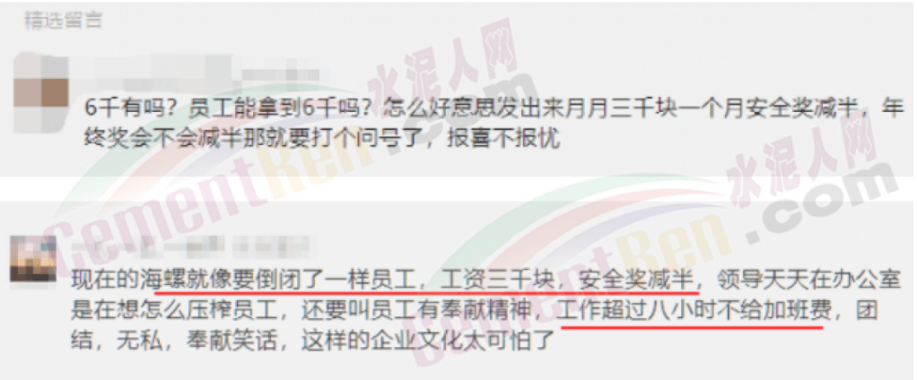 今年6月下旬,海螺水泥對于網傳“海螺裁員”消息辟謠稱,不可能裁員,效益不好的工廠部分能力強的員工會調崗到集團內另外的企業。之后又傳出海螺水泥安全獎減半的消息,且有通知稱,若企業出現虧損,年金也將取消。